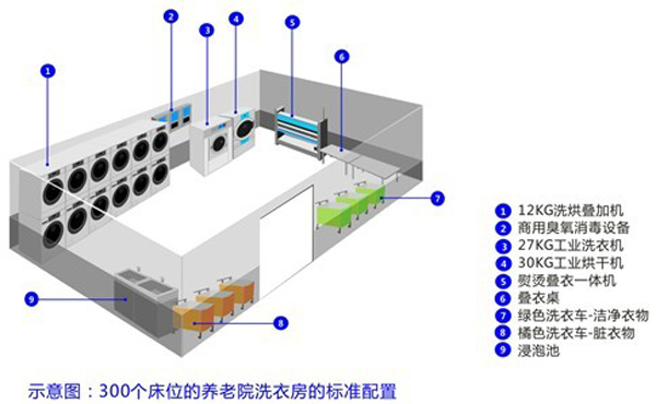目前在我國很多養老院機構還是沒有能力配備自己的洗衣房,很多都是把衣物外包給外面的洗滌公司洗滌、這些洗滌廠不僅沒有進行分類洗滌并且無法自動消毒,老人皮膚病、感染病等易互相傳染;很多洗滌廠為了節約成本都是把從不同行業中收集回來的衣物統一洗滌,比如酒店的床單被套布草也跟衣物一起混合洗滌。洗滌完了之后,衣物應該使用烘干機烘干,床單被套要使用燙平機熨燙烘干,所以為了讓養老院的老人們住的安全,穿的舒服健康,必須要給養老院配置自己的洗衣房。